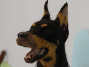 生徒さん作品紹介14「こたろうちゃん♥ハイ!チーズ! 衛藤 恵子」額から飛び出しにっこり笑ったこたろうちゃん!ハイチーズ!の言葉に反応して、振り返ったような元気な様子が感じられますね!少し茶色が混ざった黒い毛の植毛や、歯や爪まで、細部にまでこだわりの詰まった作品になりましたね!「憧れの犬 グディ 青野 順子」スラッとたくましい体格のドーベルマンですが、表情はとっても優しいグディちゃん。しなやかな体はよく骨格や筋肉をいろんな角度から観察し、繰り返し納得するまで作り込んで出来上がった力作です。耳のうねうねから口元のまで、本当によくできています!グディくんのご家族の方々も大変喜んでいらっしゃいました。「楽しいお出かけバッグ 本田 和枝」根気強く水フェルトで仕上げた、 お出かけバッグ。大ぶりのブローチは季節ごとに交換もできるようにしています。内ポケットも付いていて実用的。優しい丸みを帯びた素敵なバッグが出来上がりました。